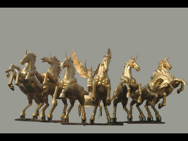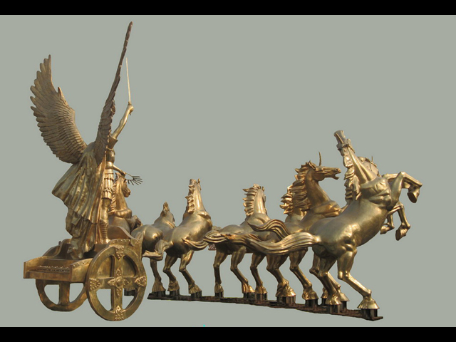 太阳神阿波罗是光明之神、真理之神、医药之神、寓言之神,他擅长弹奏七弦琴、精通箭术、聪明通晓世事。这个作品即为太阳神阿波罗的战车铜雕。
